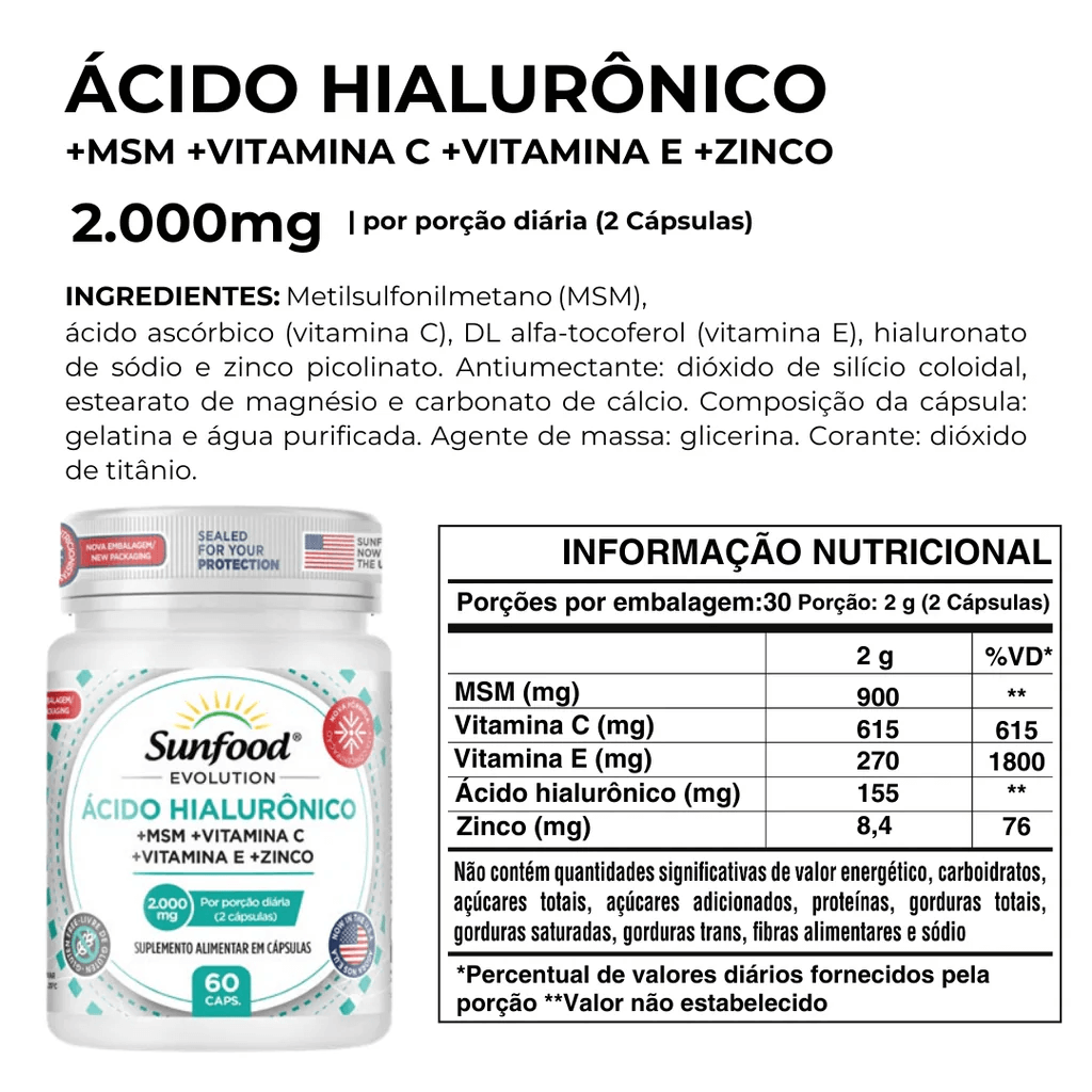 O Ácido Hialurônico Sunfood 2000mg foi desenvolvido para apoiar o equilíbrio natural do organismo, oferecendo suporte diário para quem busca cuidado contínuo, com praticidade e confiança.